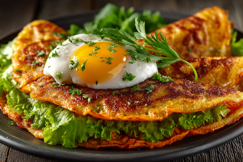 Для приготовления лепешек понадобится: крупная морковь, 100 г твердого сыра, яйцо, 1 ст. л. крахмала или муки, соль. Для наполнения: сливочный сыр, листья салата, ветчина (или что-то своё). Морковь очистите и натрите на мелкой терке. Сыр натрите на крупной терке. В миске смешайте морковь, сыр, яйцо, крахмал, соль. Перемешайте. Разогрейте духовку до 180 °C. Противень застелите пергаментом и слегка смажьте маслом, выложите на него морковную массу, формируя круглые лепешки толщиной около 0,5 см. Выпекайте 15–20 минут. Для подачи смажьте каждую тёплую лепешку сливочным сыром, уложите лист салата, ветчину или другую начинку и аккуратно сверните пополам. Ешьте сразу.