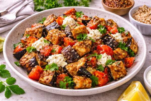 Этот салат — настоящий хит кафе и ресторанов, за которым всегда очередь. Хрустящие баклажаны, сочные томаты и пикантный соус делают его настолько вкусным, что дома его просят готовить снова и снова. А главное — готовится просто и из доступных продуктов. Сначала кажется, что блюдо сложное, но на деле всё занимает не больше получаса. Получается эффектно, ярко и очень аппетитно — идеально и для гостей, и для семейного ужина.
