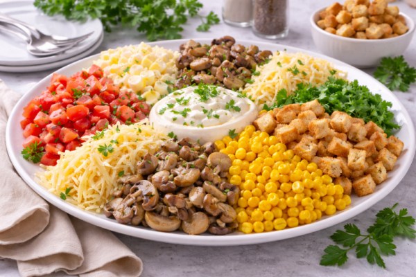 Простой, сытный и невероятно вкусный салат, который отлично подходит и для праздника, и для обычного ужина. А подача горками на большом блюде делает его особенно эффектным — гости сразу тянутся за ложкой. Сочные помидоры, нежные яйца, ароматные жареные шампиньоны, кукуруза, сыр и хрустящие сухарики создают идеальный баланс вкусов. Такой салат не надоедает и всегда выглядит аппетитно.