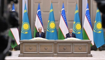 Фото: Акорда Президенты Казахстана и Узбекистана провели совместный брифинг для представителей СМИ, пе ...