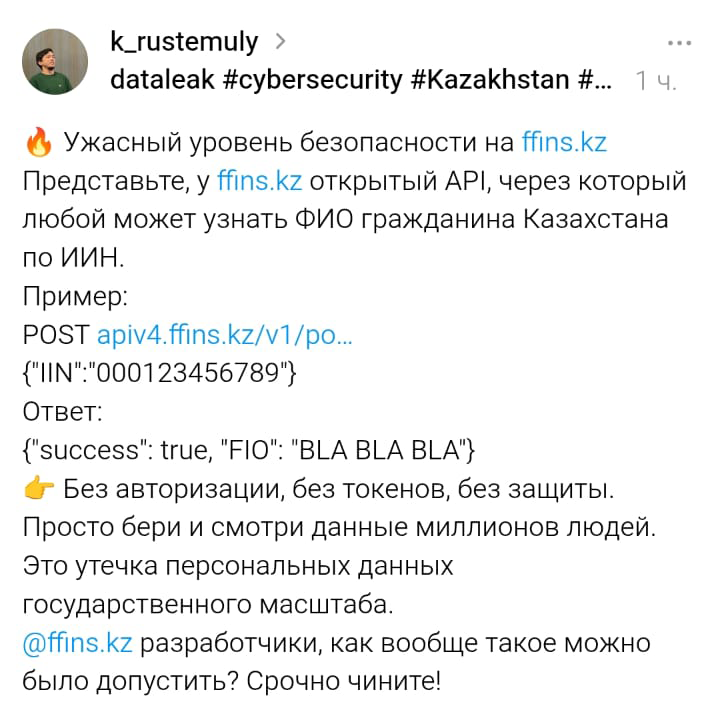 «Без авторизации, без токенов, без защиты. Просто бери и смотри данные миллионов людей. Это утечка персональных данных государственного масштаба. @ffin.kz разработчики, как вообще такое можно было допустить? Срочно чините!», — написал Куаныш Османов в социальных сетях.