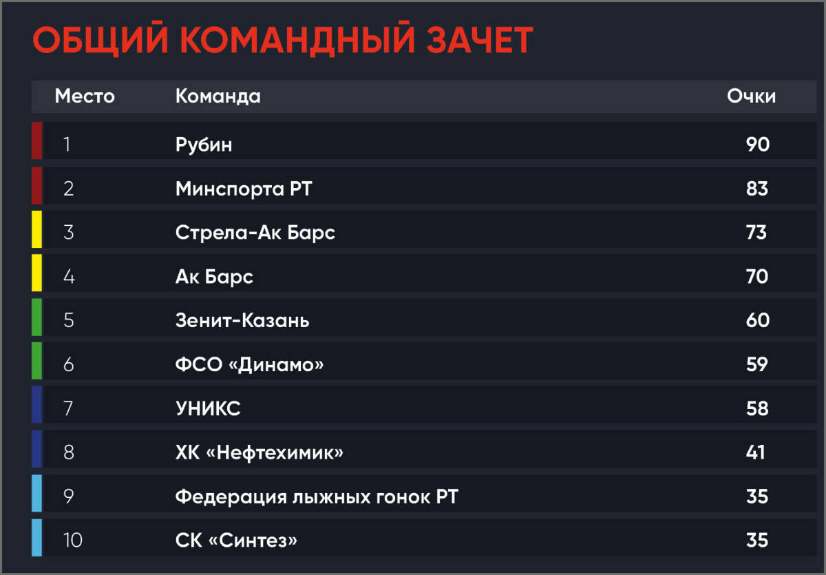 Между тем «Ак Барс» уже четвертый в общем командном зачёте. И до топ-3 всего 3 очка. Напомним, там располагается регбийная «Стрела-Ак Барс», которая в первой половине нашего исследования отметилась целым рядом трофеев. Но сейчас у регбистов межсезонье, и поэтому «Стрелу» потихонечку догоняют признанные фавориты, в том числе «Ак Барс».