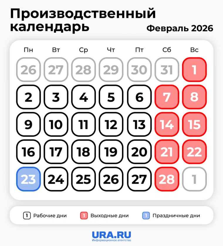 Февраль 2026 — месяц короткий, но насыщенный. У россиян есть 9 выходных и сразу несколько важных праздников. Нужно заранее знать, сколько дней придётся работать, когда можно уехать в отпуск, а когда — устроить праздник. Сколько рабочих дней в феврале 2026, будут ли переносы, как рассчитать отпускные — в производственном календаре URA.RU.