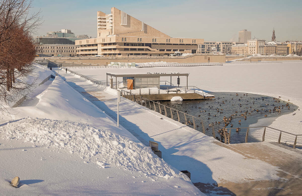 Часть набережной вынесут на воду: деревянный настил установят на сваях. Павильон разместят у крутого склона, его кровля будет эксплуатируемой. На первом этапе обустроят нижний променад и прилегающую территорию, в том числе небольшую смотровую площадку у павильона.