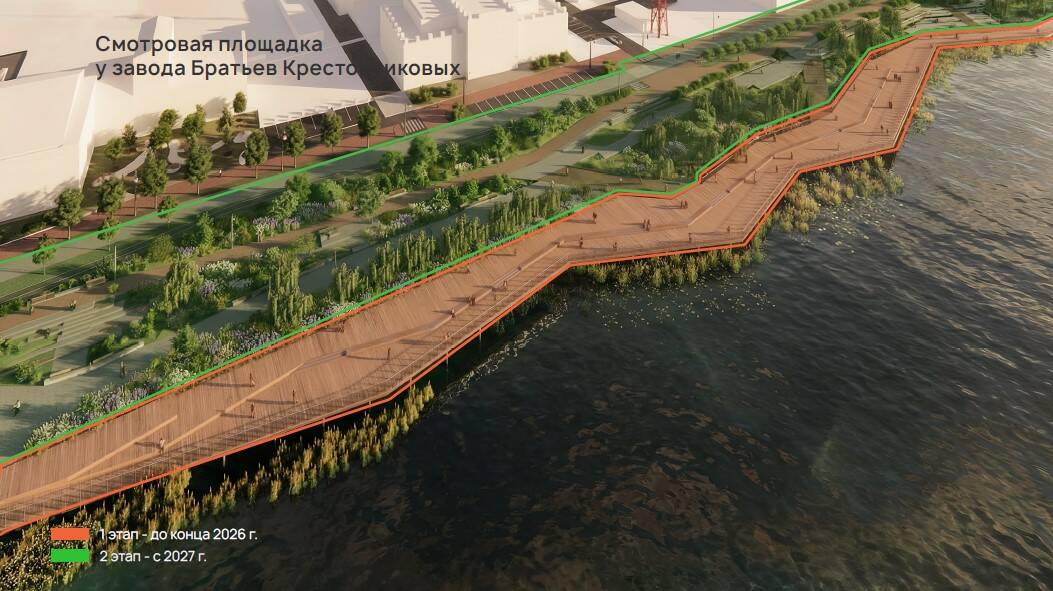 Одной из ключевых точек станет территория напротив Завода братьев Крестовниковых. Здесь обустроят широкий деревянный настил площадью около 2,5 тыс. кв. метров.