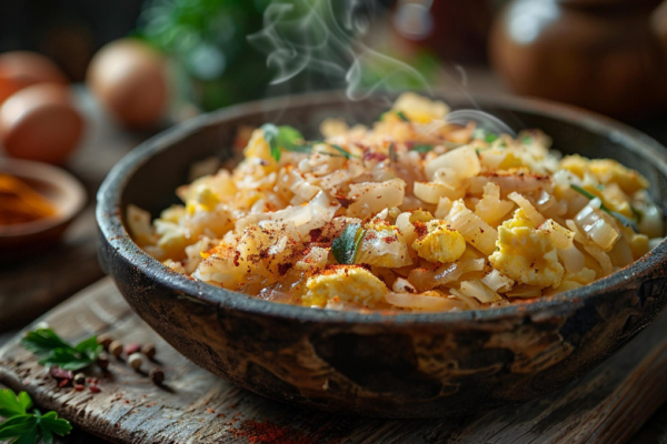 Лук тонко нарезать перьями и прогреть на сковороде с маслом до прозрачности и лёгкой сладости. Капусту нашинковать как можно тоньше, соединить с луком, добавить 2–3 столовые ложки воды и готовить под крышкой около 10 минут на умеренном огне, чтобы она стала мягкой, но не потеряла структуру. В конце вмешать куркуму — она придаст блюду тёплый золотистый оттенок и деликатный пряный аромат.