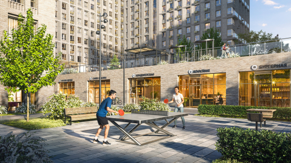 При этом ключевая ценность проекта — в подходе к формированию среды. Территория площадью около 0,9 га организована как единое пространство для жизни: здесь предусмотрены детские площадки для разных возрастов, зоны отдыха для взрослых с гамаками и шезлонгами, спортивные активности и даже «зелёные кабинеты» для работы на свежем воздухе с доступом к Wi-Fi. Между корпусами проходит пешеходный бульвар с кафе, магазинами и сервисами — место для повседневных встреч и общения.