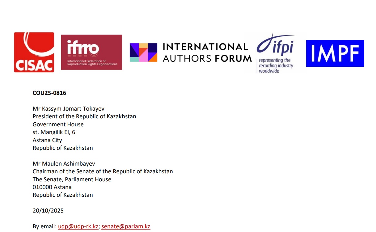20 октября 2025 года пять крупнейших международных организаций — CISAC, IFRRO, IAF, IFPI и IMPF, представляющие интересы более пяти миллионов авторов, композиторов, издателей и продюсеров по всему миру, направили открытое письмо президенту Казахстана Касым-Жомарту Токаеву и председателю сената парламента Маулену Ашимбаеву.