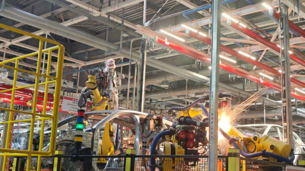…Особенный ритм ощущается в сварочном цехе. Здесь, на площади почти в 41 тыс. кв. м все чётко регламентировано, как впрочем, и на других участках конвейера. На каждом посту, неважно кто на нём трудится – человек или робот, – операция выполняется максимум пять минут, поэтому тут точно выверено каждое движение. 70% сварочных работ на заводе выполняют люди, и только около трети из не менее трёх тысяч точек, необходимых для создания полуфабриката, соединяют роботы.
