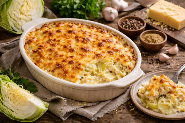 На выходе — настоящее удовольствие: мягкие капустные слои, пропитанные сливками, тают во рту и оставляют тонкое чесночное послевкусие, а сверху — румяная, слегка хрустящая сырная шапка, которую хочется подцепить вилкой ещё до подачи. Просто, доступно и удивительно вкусно.