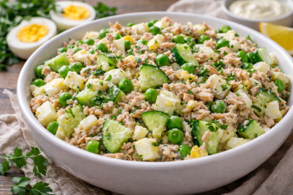 Ингредиенты: тунец в собственном соку — 1 банка, яйца — 2 шт., свежий огурец — 1 шт., зелёный горошек — 1 банка. Заправка: сметана или лёгкий майонез — 1–2 ст. л., горчица — 1/2 ч. л., соль — щепотка.