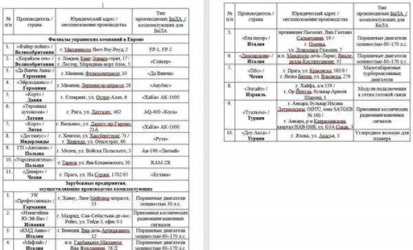 Минобороны опубликовало список филиалов украинских компаний в Европе, которые производят беспилотники и комплектующие к ним, а также список зарубежных предприятий, изготовляющих только комплектующие. В первом списке 11 пунктов, во втором — 10. Согласно перечню, БПЛА для ударов Украины по России производят в том числе в Лондоне, Мюнхене, Праге, Риге, Вильнюсе.
