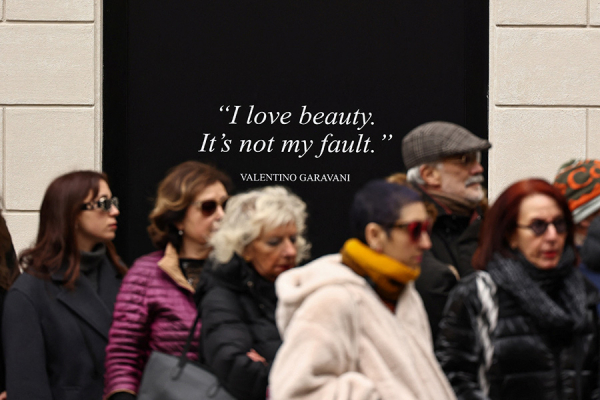 На стене у лестницы центра PM23, где проходит траурное мероприятие, написана одна из знаменитых цитат Валентино: «Я люблю красоту, это не моя вина».