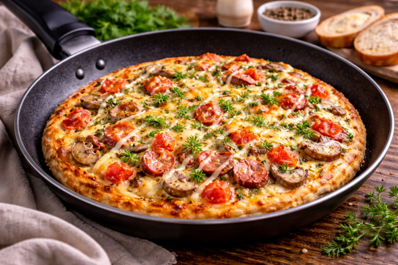 Эта пицца — идеальный вариант, когда хочется быстро приготовить что-то вкусное и сытное. Без духовки, без дрожжей и долгого замеса. Основа получается мягкой внутри и румяной снаружи, а начинку можно менять по настроению. Подходит для завтрака, ужина и неожиданных гостей.